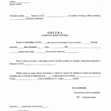 VAŽNO: OBAVEZNO PRIPREMITE OVJERENE ODLUKE O POSTAVLJENJU LOVNIKA KOJE VAM TAKOĐER ŠALJEMO U PRIVITKU JER ĆETE NA TEMELJU NJIH DOBITI I NUMERIRANE ISKAZNICE I ZNAČKE.